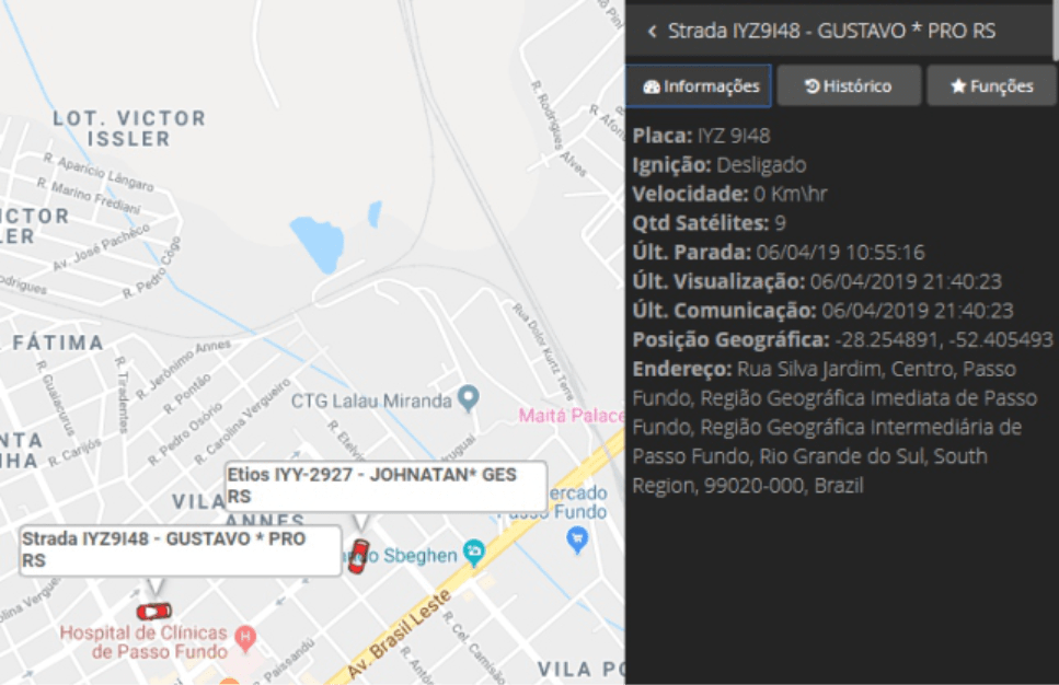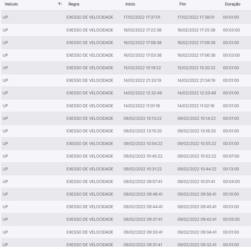 Facilidade na hora de obter histórico completo dos veículos. Nos trajetos, informações de início, paradas, excessos de velocidade e fim de trajeto são facilmente visíveis através de ícones.
