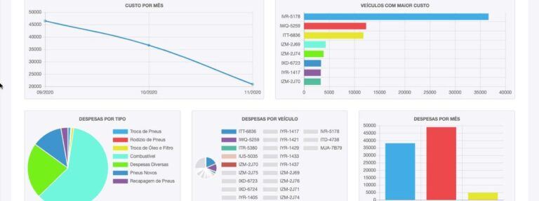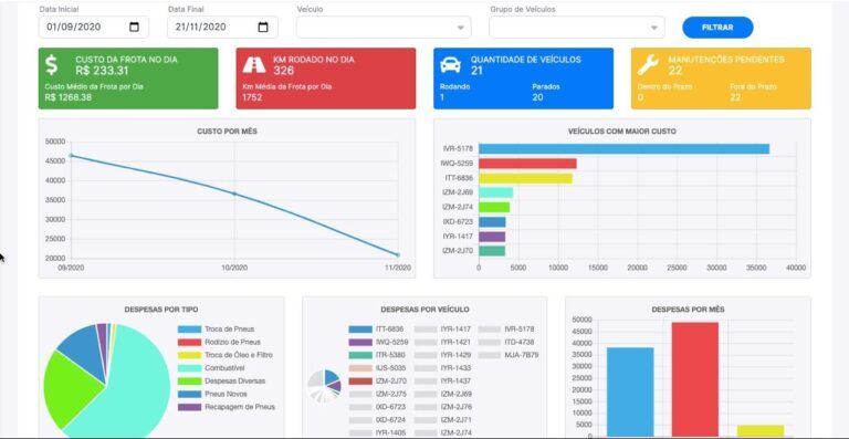 Dashboard foi projetado para controlar os custos da frota em tempo real. O cálculo é feito conforme os deslocamentos dos veículos durante o dia. Também é possível comparar os custos dos meses e veículos com maiores custos no período selecionado.