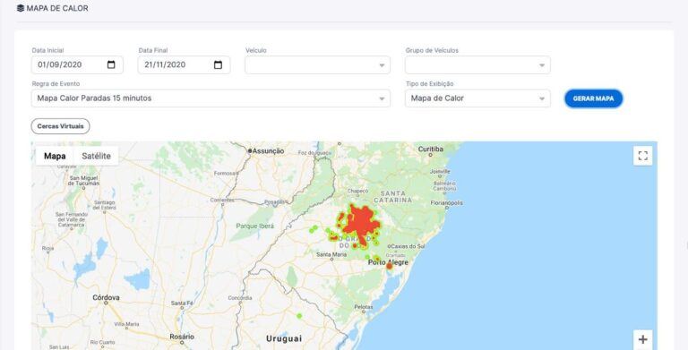 Mapa de calor é usado para medir a intensidade de eventos que ocorrem no mesmo espaço geográfico. Conforme a intensidade aumenta, o mapa fica mais escuro. Segue um exemplo da quantidade de paraas superior a 15 minutos. Neste caso o cliente usa o recurso para identificar as regiões onde os veículos estão visitando clientes.
